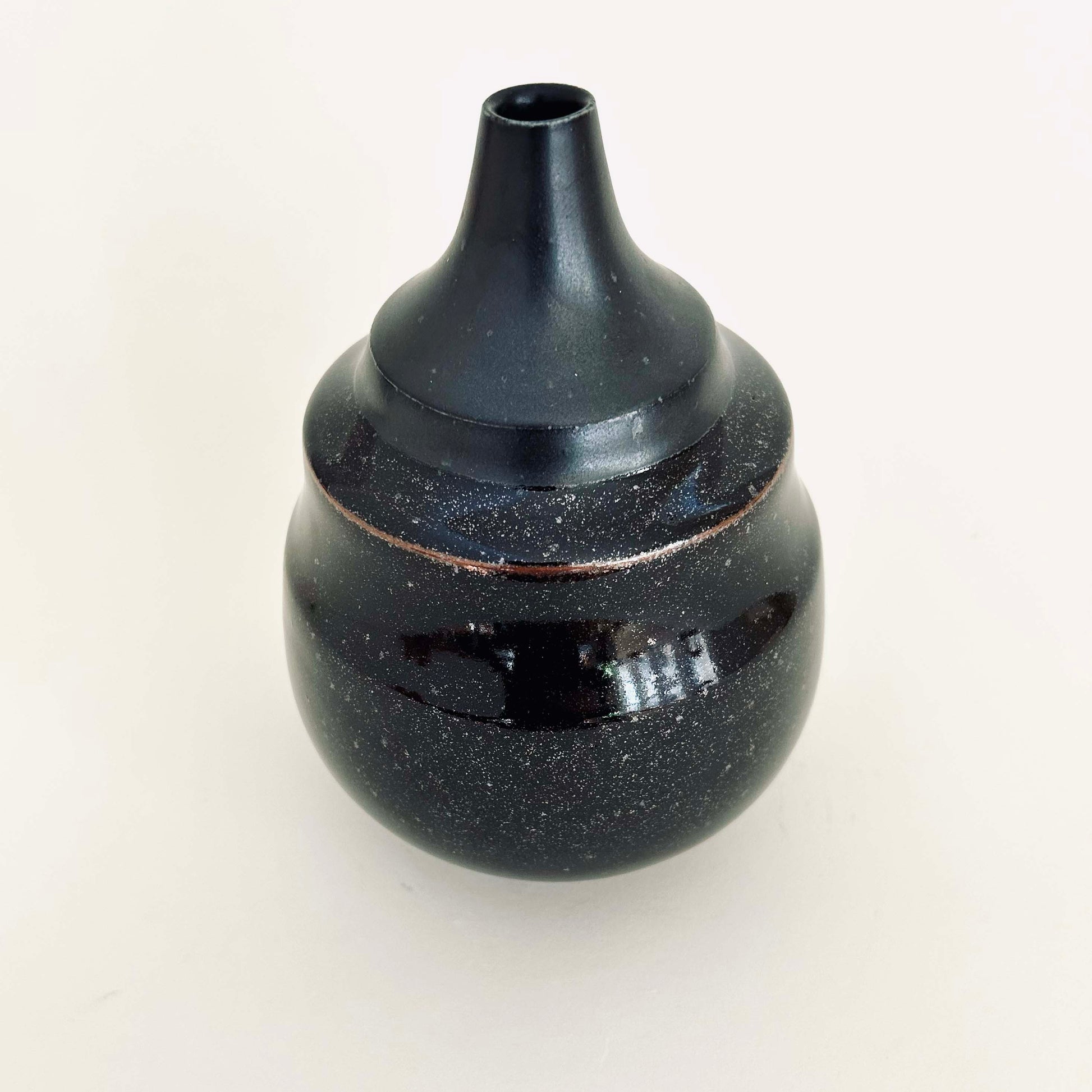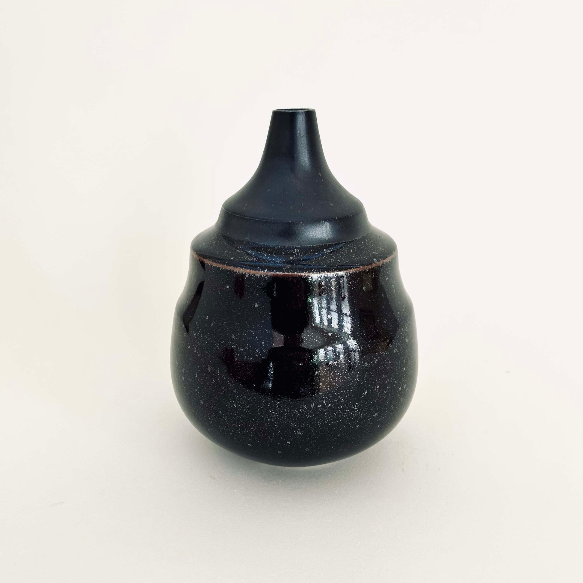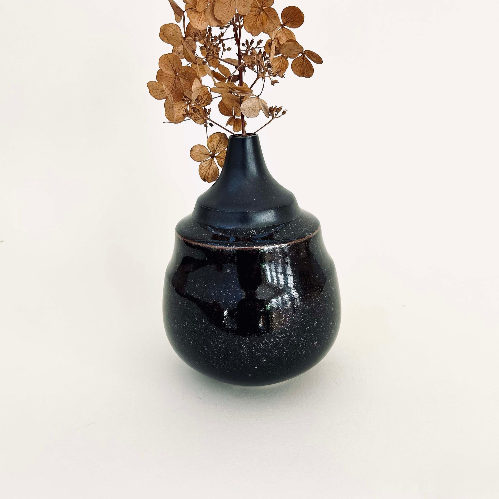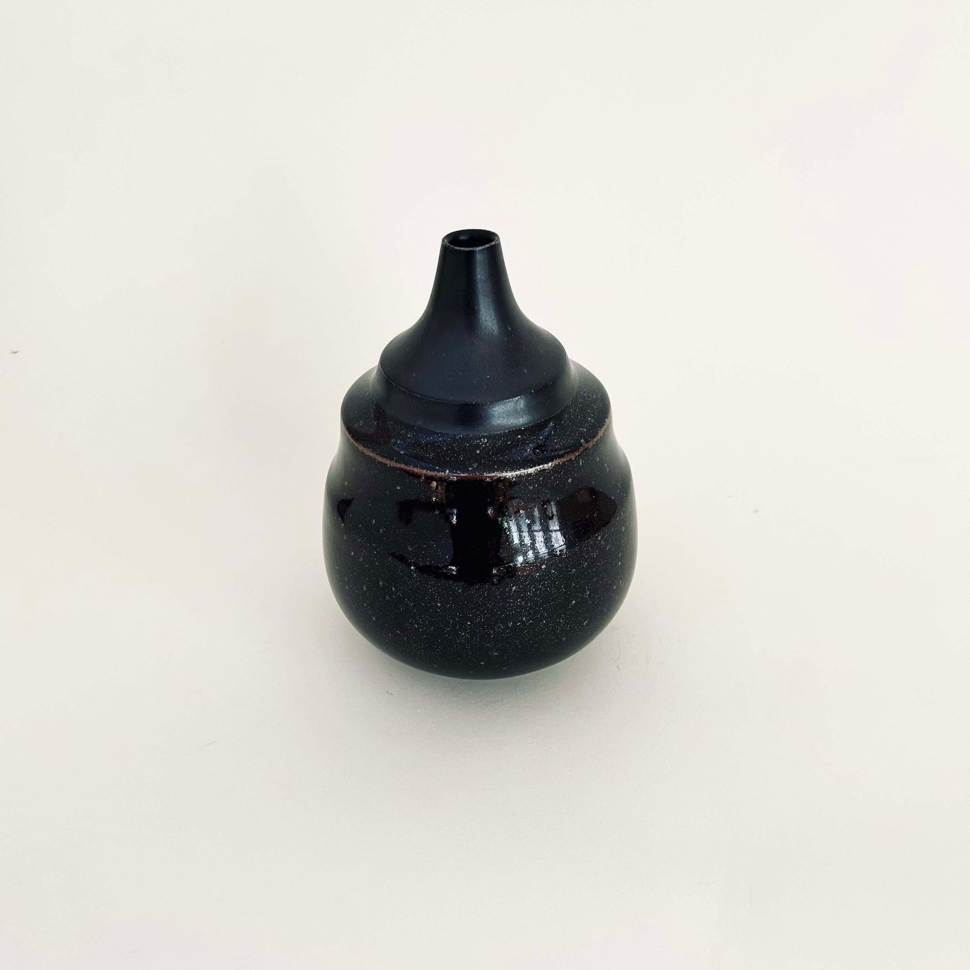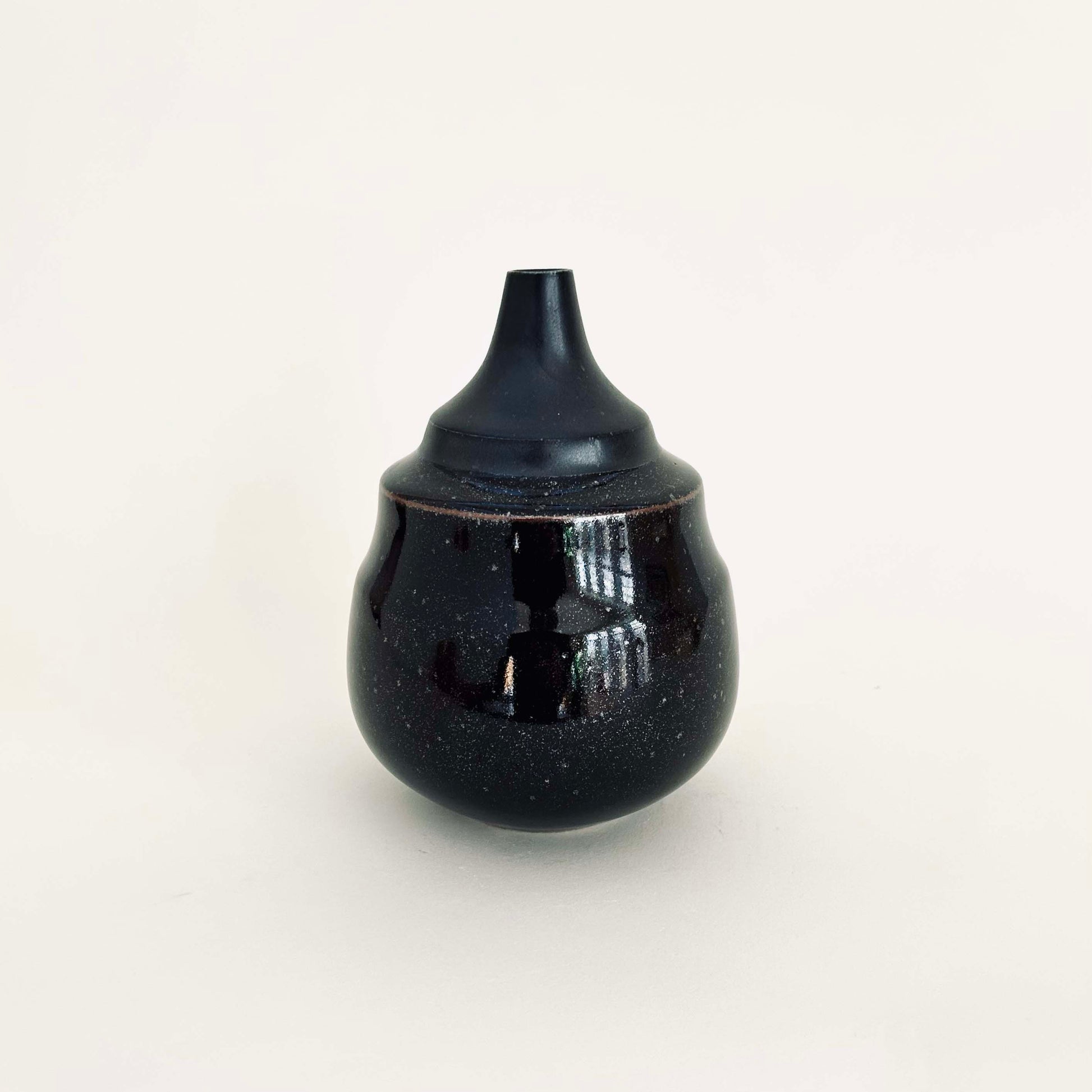 This refined bud vase form is handcrafted in stoneware with Satin Black and Oil Spot glaze finishes, bringing texture and refinement to the curved form. This distinctive design will enhance a simple floral display while bringing a bit beauty to any space.