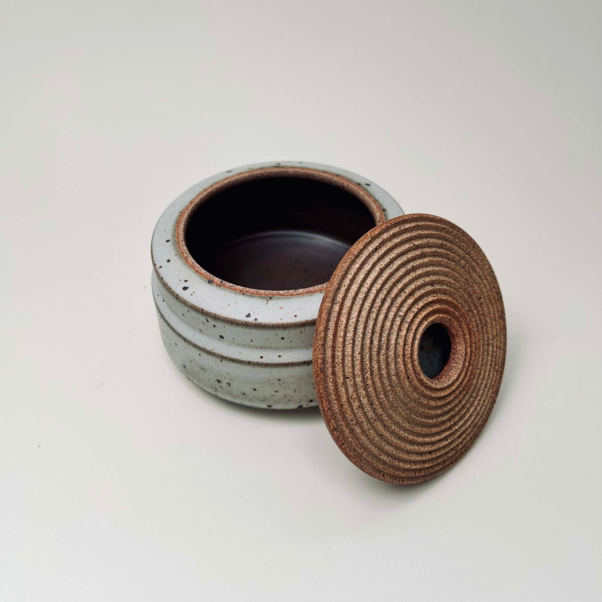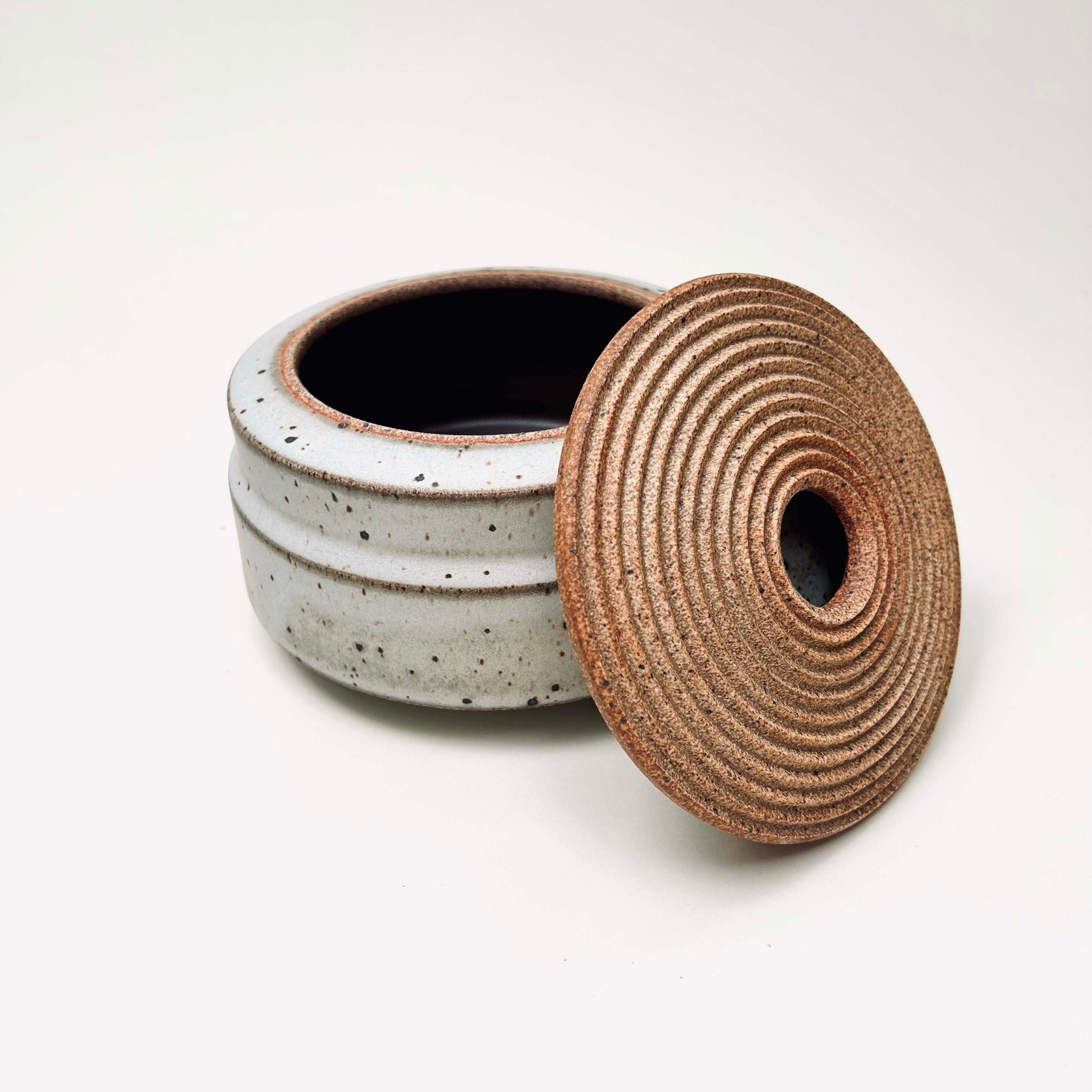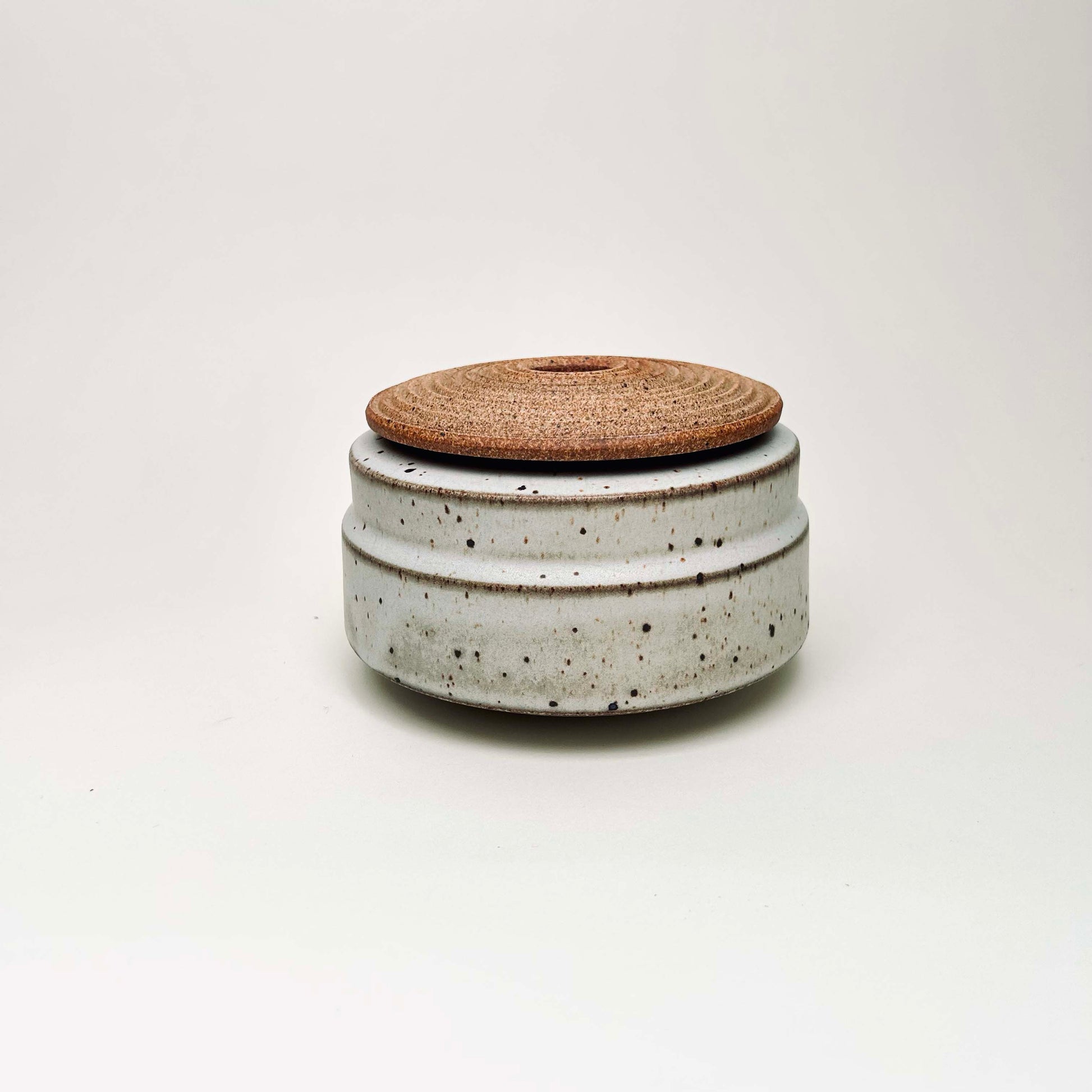 Hand-thrown and high-fired, this stoneware lidded vessel incorporates both glazed and unglazed finishes, bringing together a visual and tactile contrast to the design resulting in a timeless aesthetic that brings versatility to store and contain.