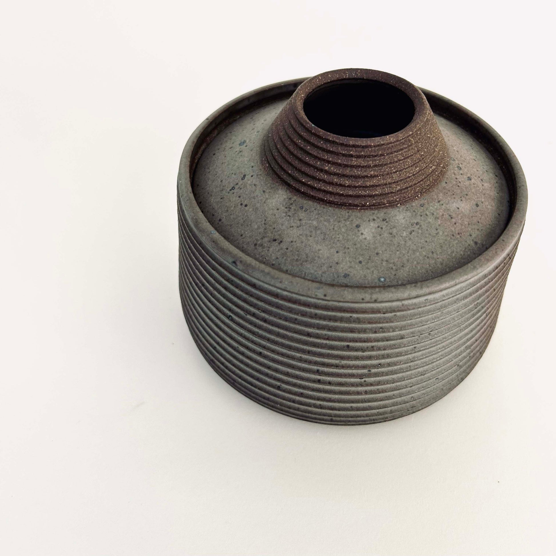 Hand-thrown and high-fired, this small lidded vessel is finished with a matte gray glaze. The use of textured surfaces and a tapered form creates a honed modern aesthetic to a functional solution for storing and containing.