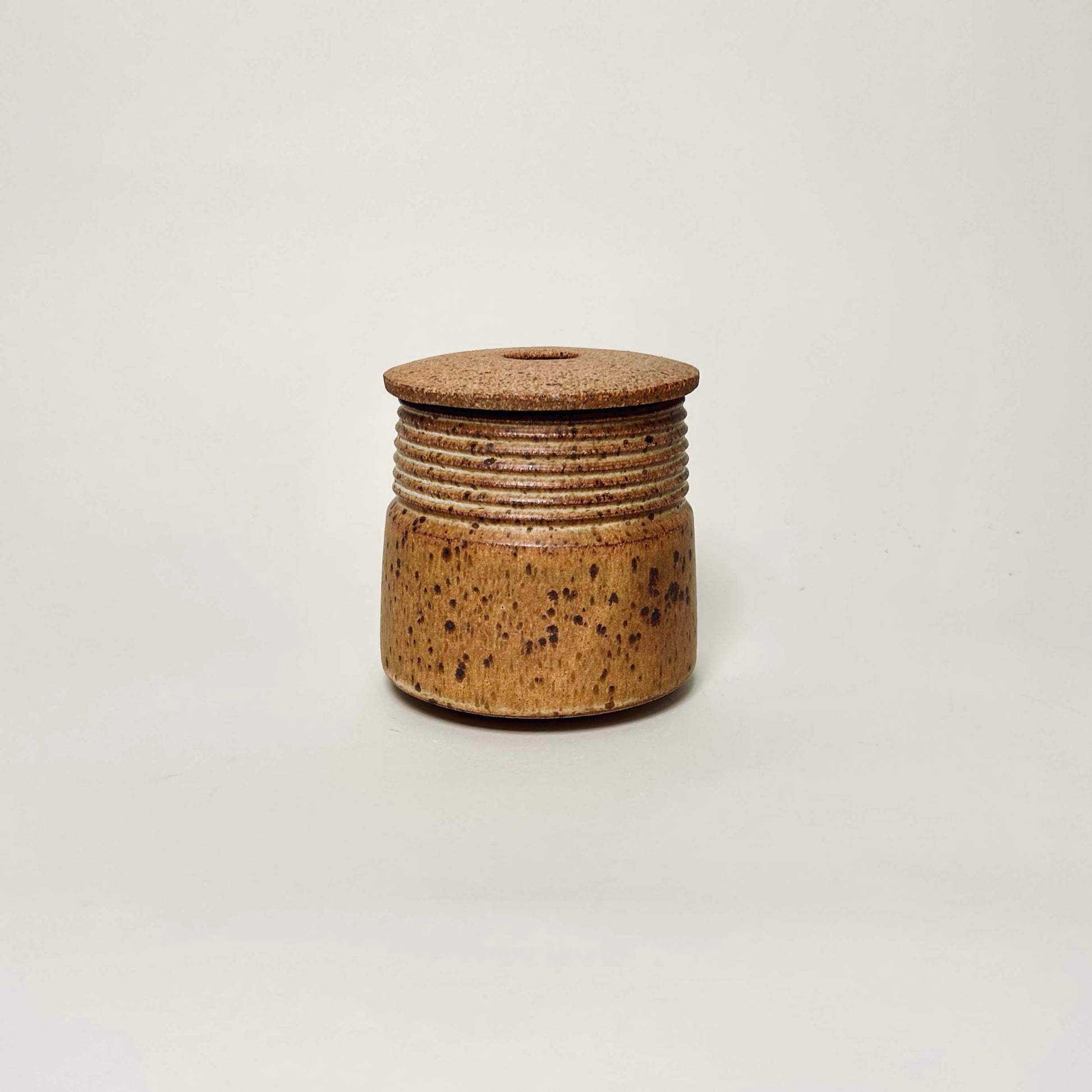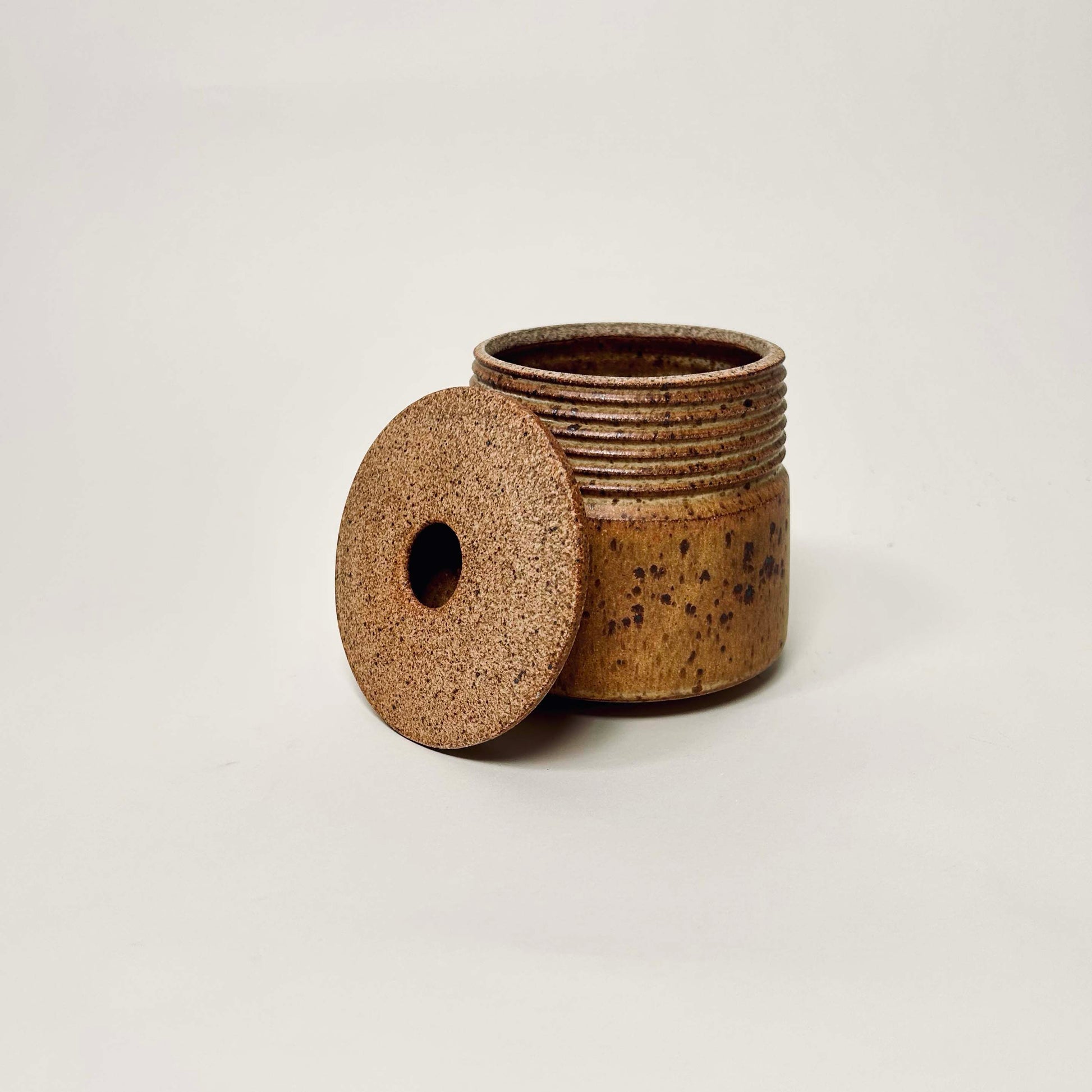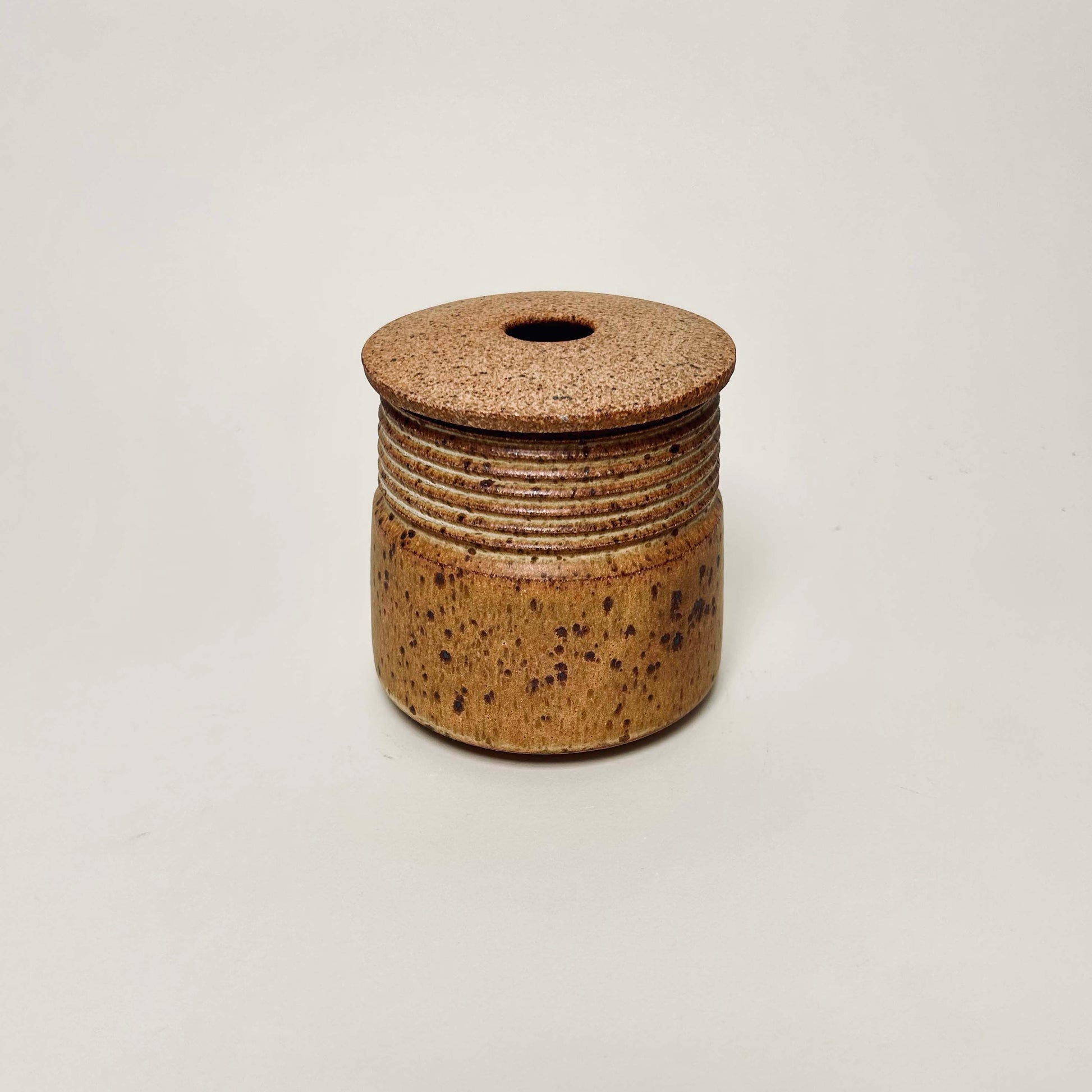 Hand-thrown and high-fired, this small lidded vessel is finished in a matte glaze in combination with an unglazed lid. The use of textures and simplicity of form creates a timeless aesthetic.