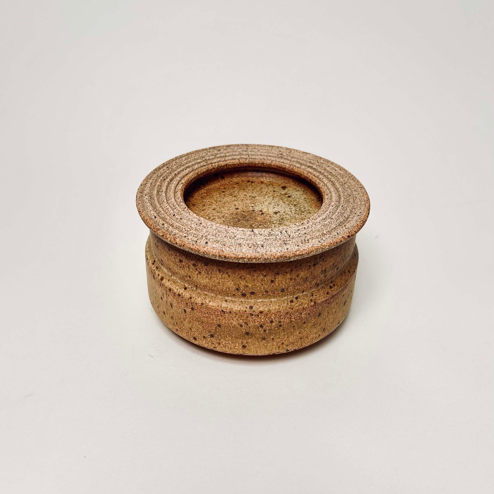 Hand-thrown and high-fired, this angular lidded vessel is finished in a golden brown speckled matte glaze in combination with an unglazed textured lid. The use of textures and simplicity of form creates a timeless aesthetic.