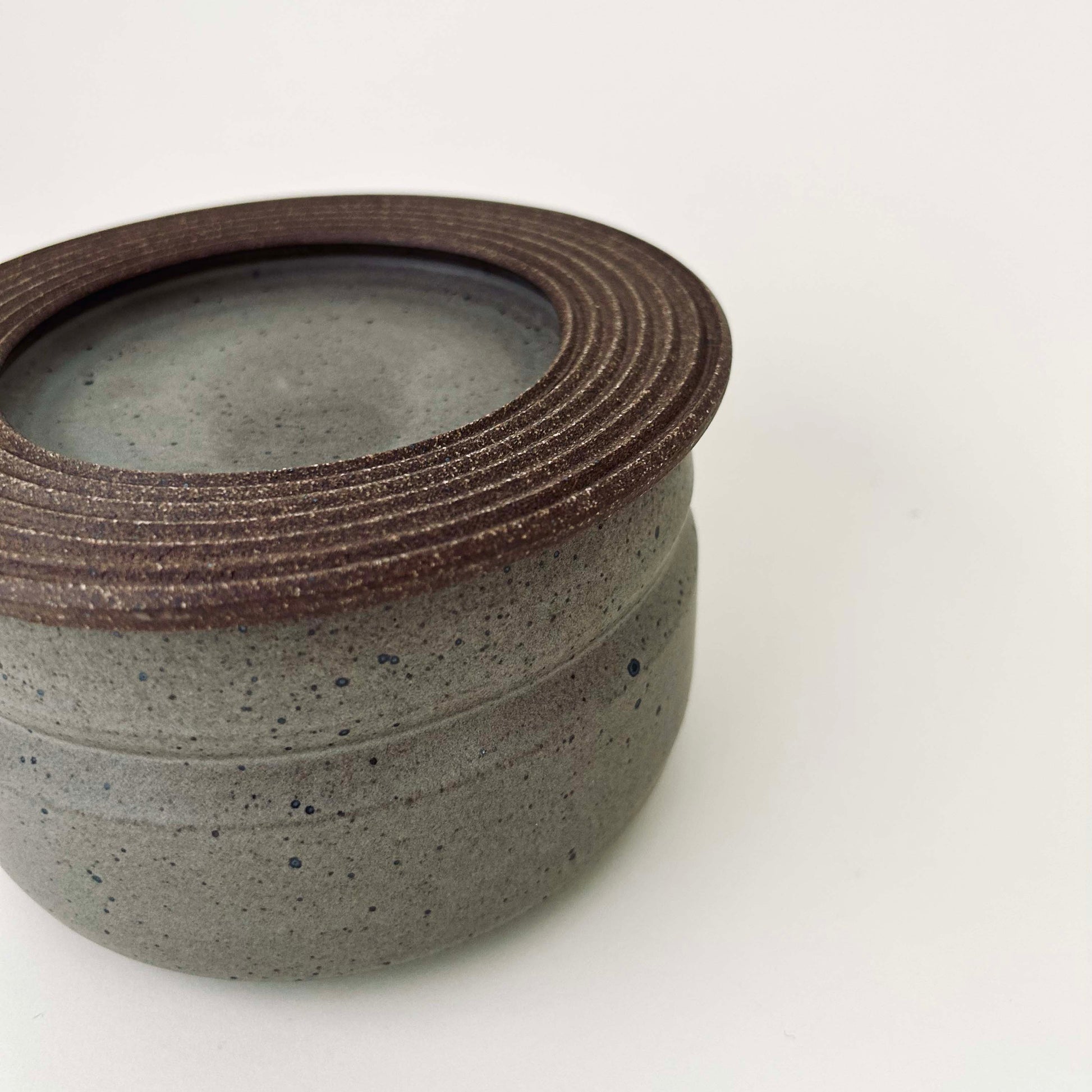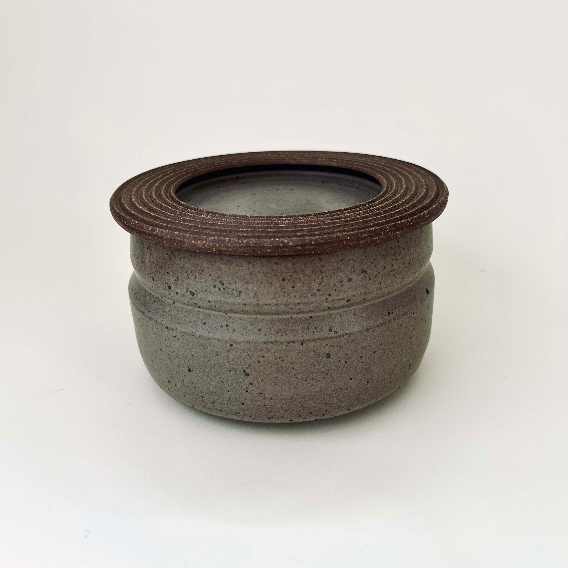 Hand-thrown and high-fired, this angular lidded vessel is finished in a golden brown speckled matte glaze in combination with an unglazed textured lid. The use of textures and simplicity of form creates a timeless aesthetic.